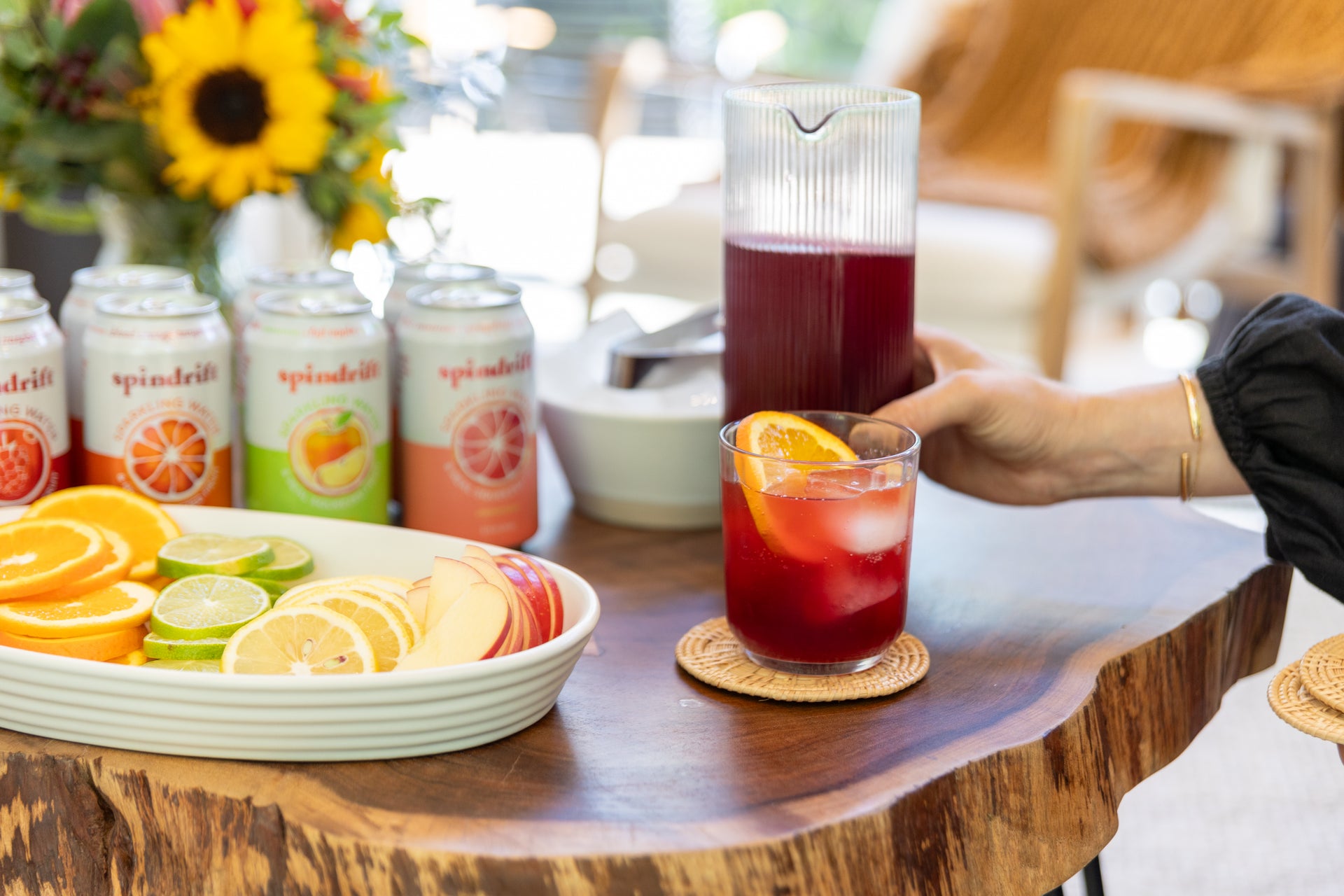 Guests will love the opportunity to customize their own drink - so we recommend arranging a garnish station with all your favorite fresh fruits. We used oranges, limes, lemons, and apples to go with our chosen Spindrift flavors. But you can also add fun, festive garnishes like cranberries, cinnamon sticks, star anise, orange peels, thyme, mint, or even edible flowers.